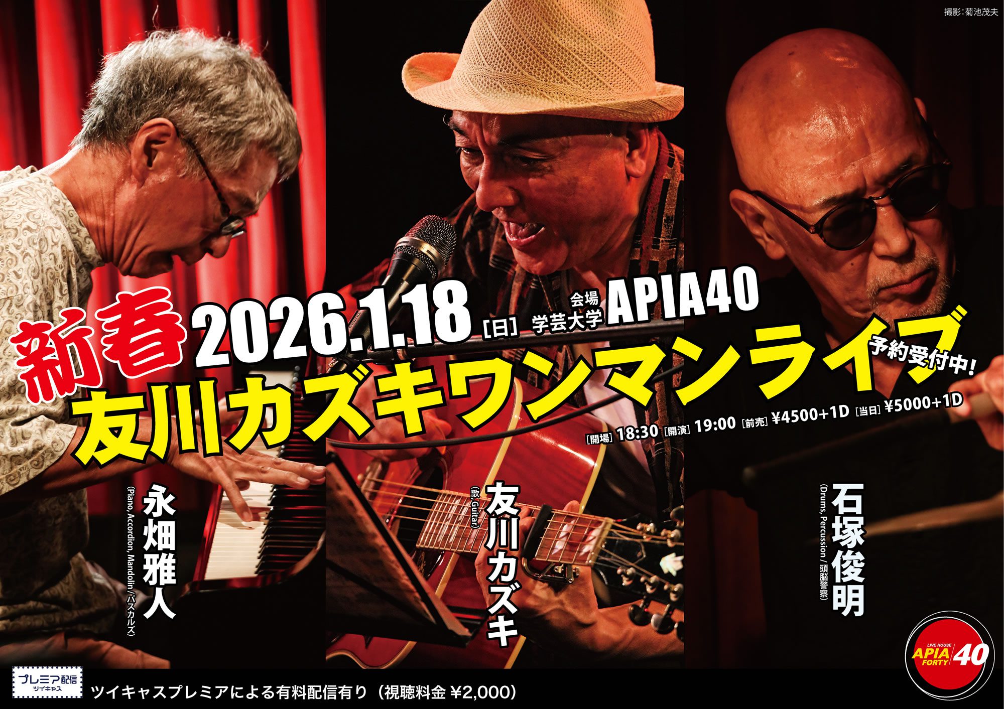 友川カズキが1970年代より主戦場として数多の戦を繰り広げたアピアにて、盟友二人を従えたトリオ編成でのライブを開催。石塚俊明(dr,per/頭脳警察)、永畑雅人(p,acc,mand/パスカルズ)という最強の布陣で繰り広げる、調和とも衝突ともつかない出鱈目の応酬は、言葉を超え、音楽を超え、明後日の方角へと跳躍する。吉と出るか、凶と出るか、2026年を占う新春ライブ!