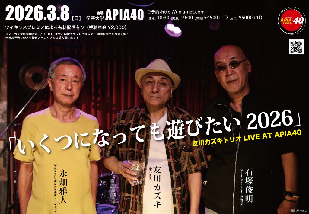 友川カズキが1970年代より主戦場として数多の戦を繰り広げたアピアにて、盟友二人を従えたトリオ編成でのライブを開催。石塚俊明(dr,per/頭脳警察)、永畑雅人(p,acc,mand/パスカルズ)という最強の布陣で繰り広げる、調和とも衝突ともつかない出鱈目の応酬は、言葉を超え、音楽を超え、明後日の方角へと跳躍する。いくつになっても遊びたい!