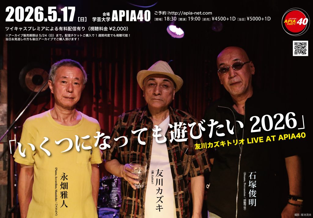 友川カズキが1970年代より主戦場として数多の戦を繰り広げたアピアにて、盟友二人を従えたトリオ編成でのライブを開催。石塚俊明(dr,per/頭脳警察)、永畑雅人(p,acc,mand/パスカルズ)という最強の布陣で繰り広げる、調和とも衝突ともつかない出鱈目の応酬は、言葉を超え、音楽を超え、明後日の方角へと跳躍する。いくつになっても遊びたい!