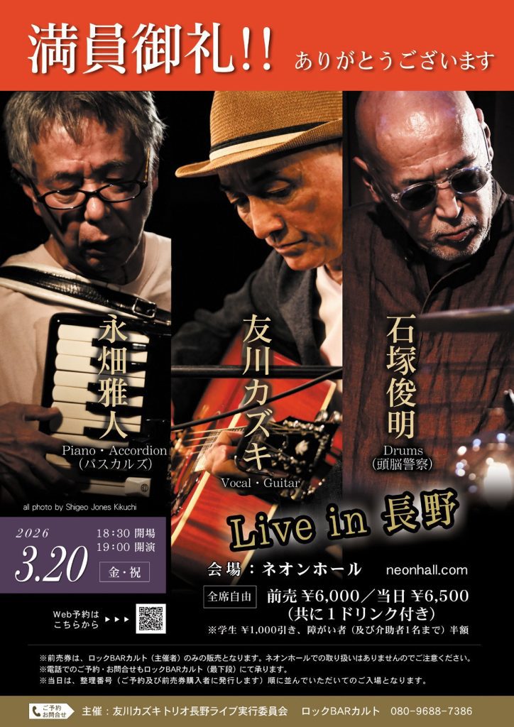 主催:友川カズキトリオ長野ライブ実行委員会 ロックBARカルト 080-9688-7386