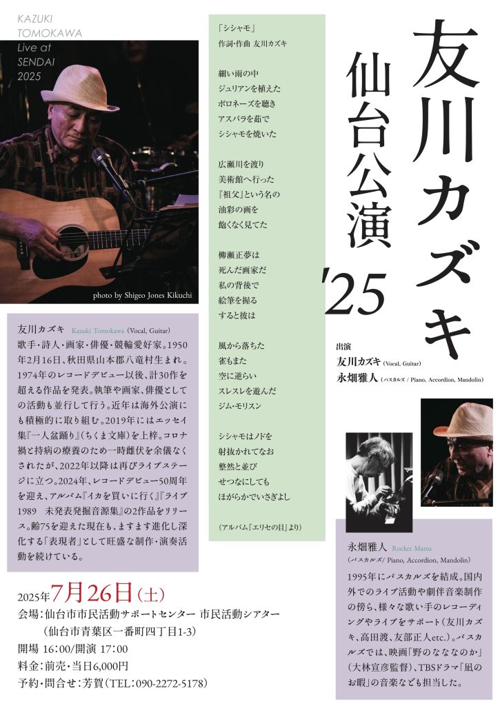 出 演 : 友川カズキ(Vocal, Guitar)、永畑雅人(パスカルズ / Piano, Accordion, Mandolin)